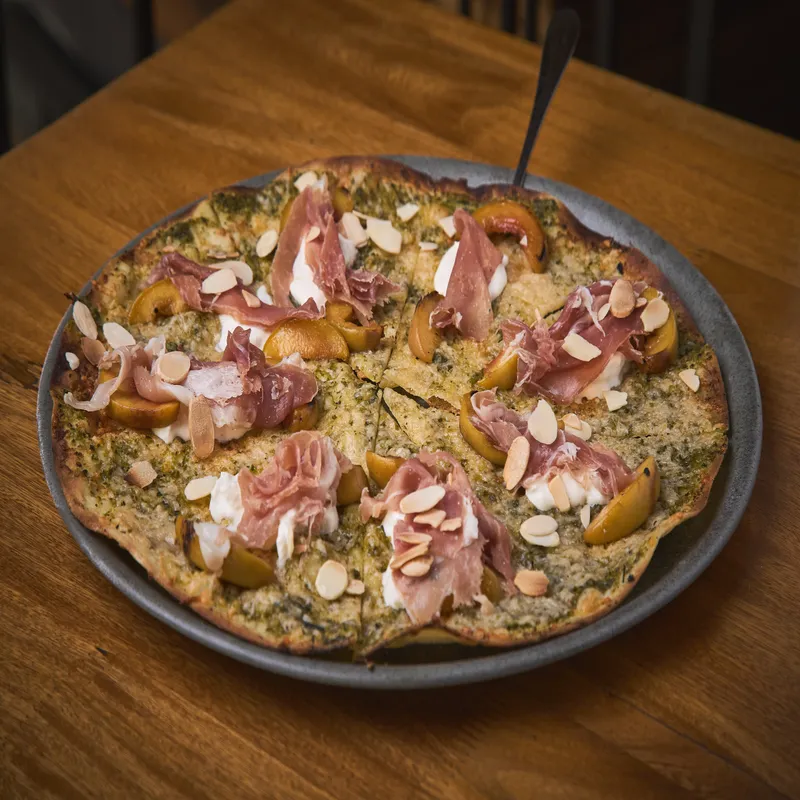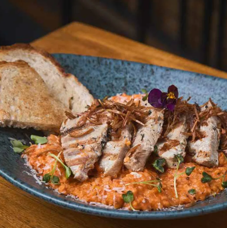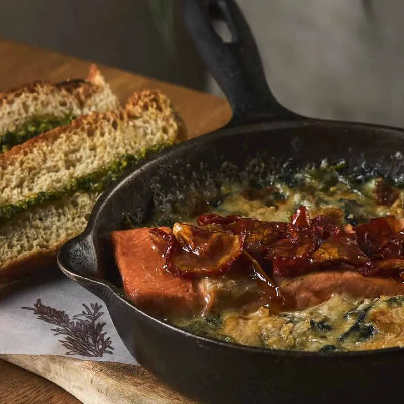 Deliciosa cacerola con queso mozzarella, queso parmesano y espinaca gratinada en nuestro horno. Acompañada de tostones de pan focaccia con pesto rústico.