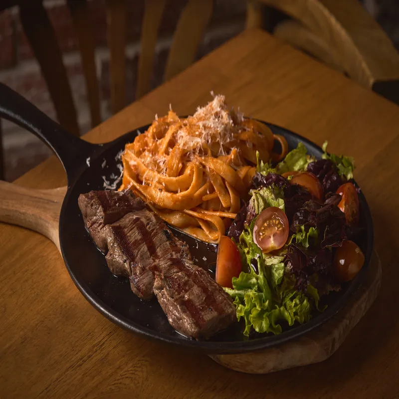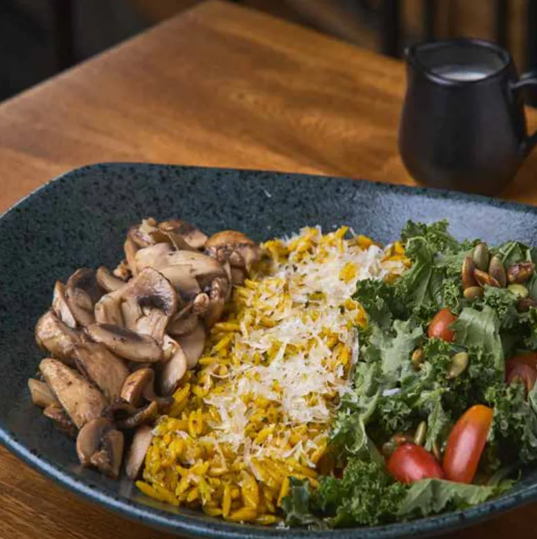 Nuestro delicioso risotto de cuatro quesos con almendras tostadas,acompañado de un jugoso medallón de solomito.