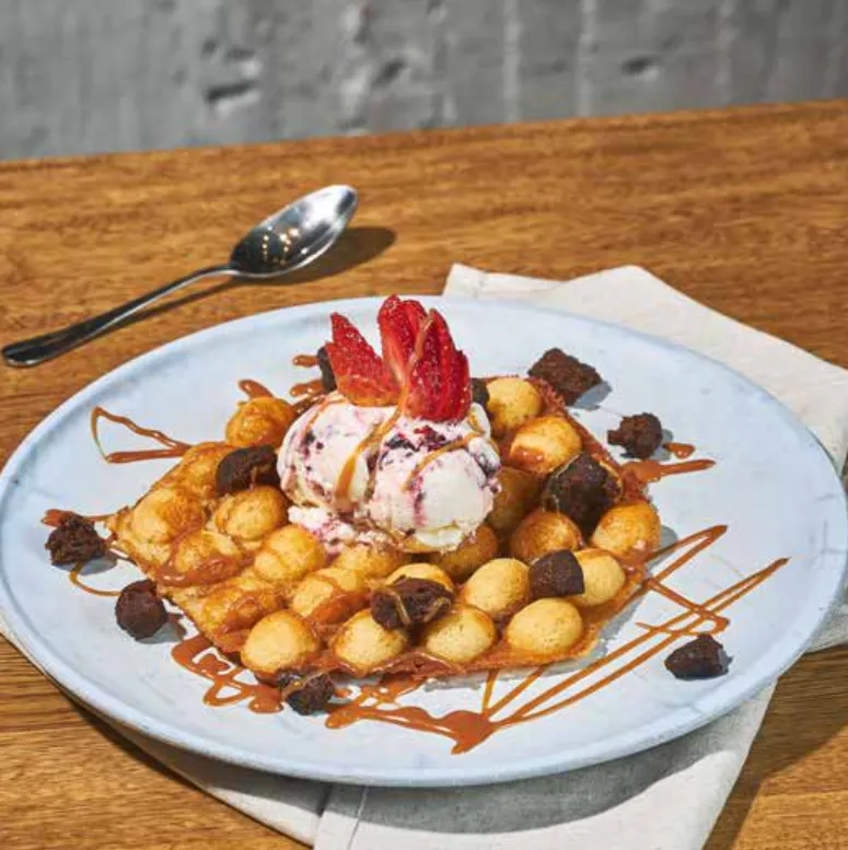 Del horno a la mesa, galleta crocante con pedacitos de chocolate fundido, acompañada de helado.